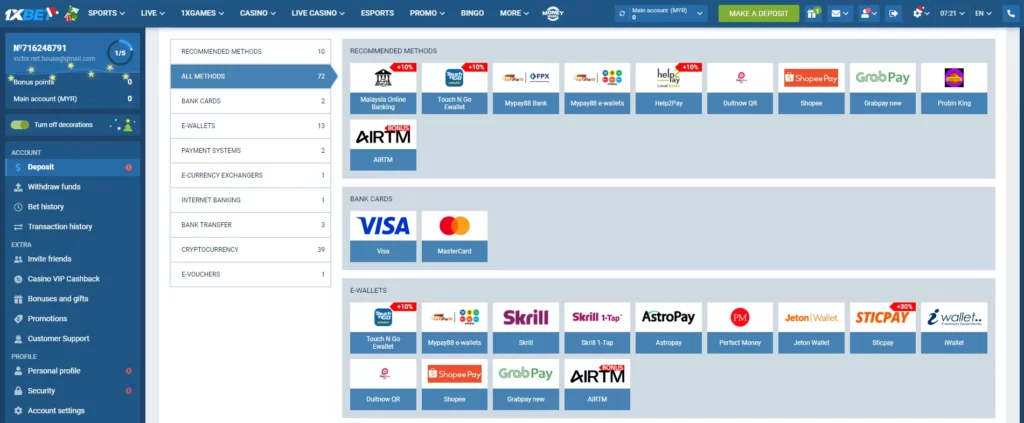 Once your identity is verified, you’re all set to make your first deposit. 1xBet Philippines supports a wide range of secure and convenient payment methods tailored for local players, including: